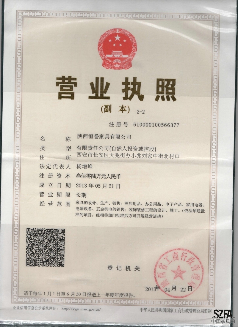 證書介紹 陜西恒譽家具有限公司是一家集高檔辦公家具、星級酒店家具和校用家具的開發(fā)設計、生產及銷售為一體的企業(yè)。